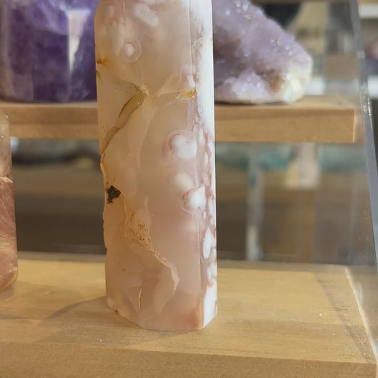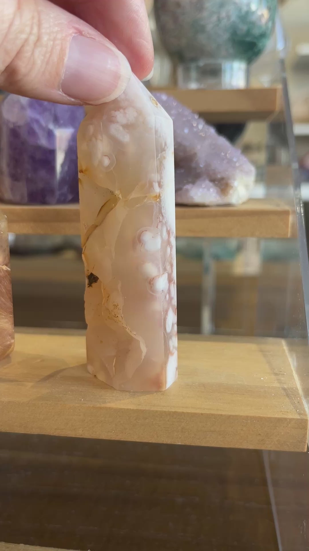 3.10” tall .9” wide hexagonal Flower Agate pillar. This unique Flower Agate piece features beautiful botriodal formations on one polished facet, making it a one-of-a-kind piece for any crystal collection. Translucent whites, browns and cinnamons mix in this stunner. 62g.