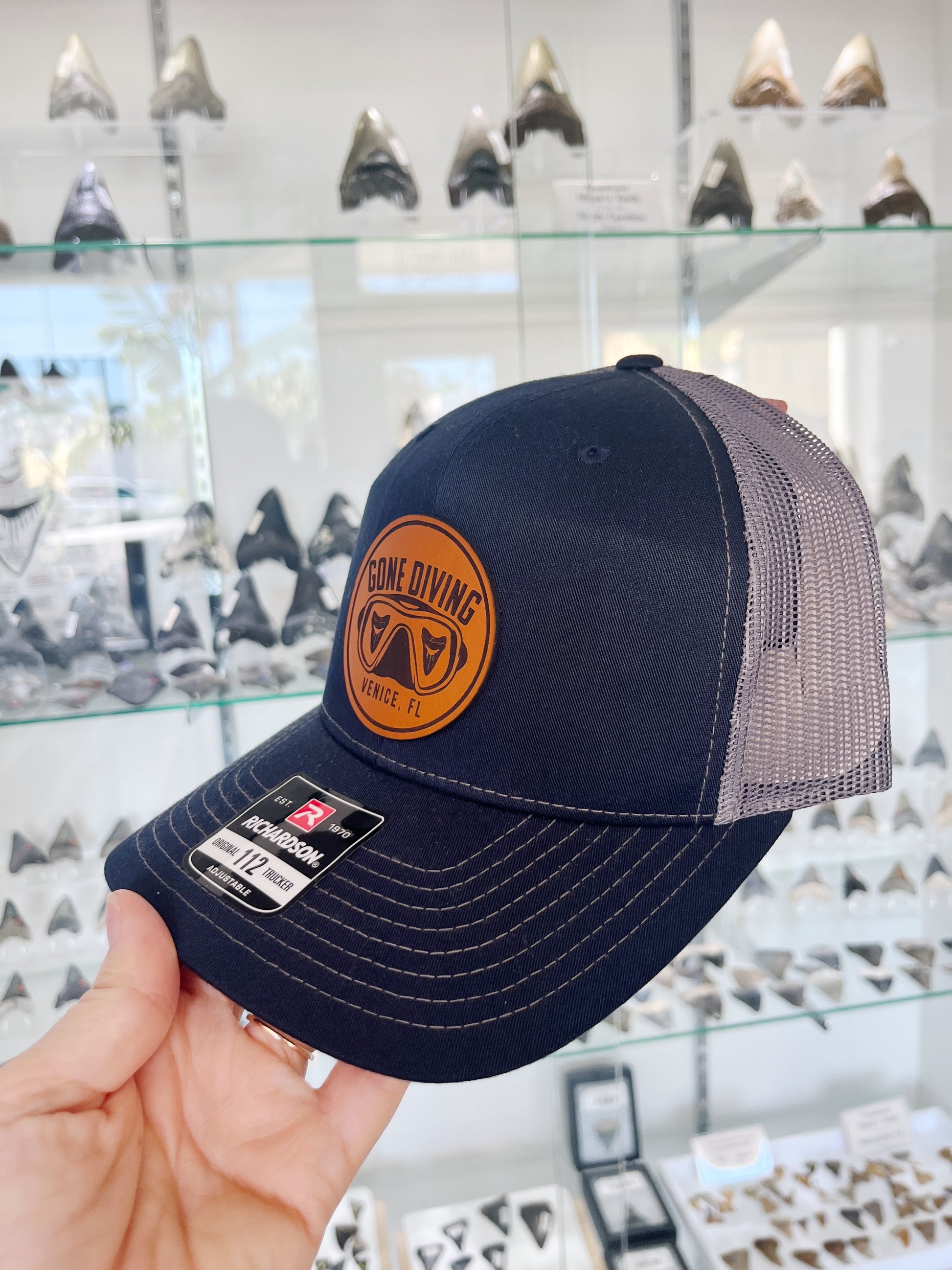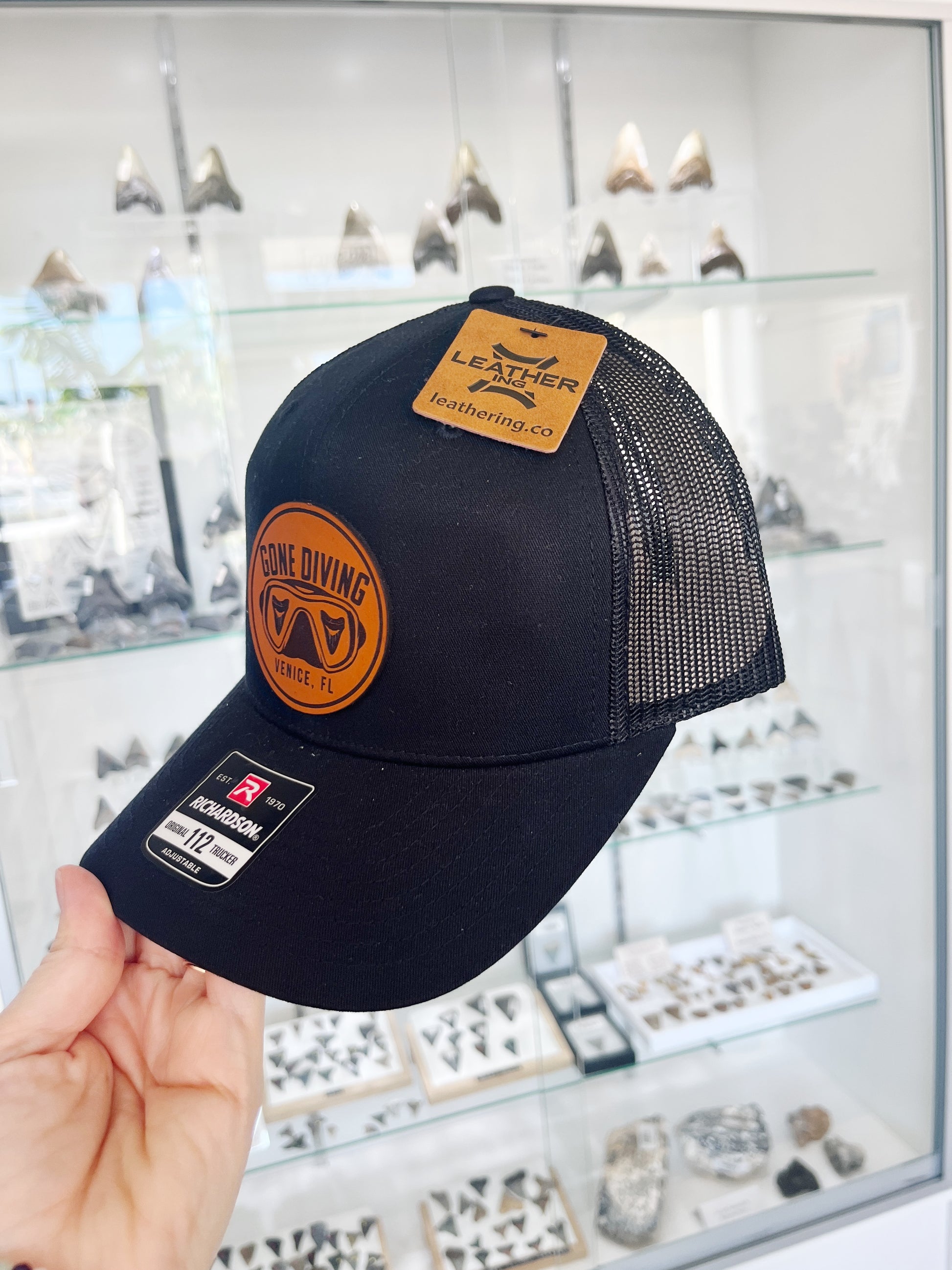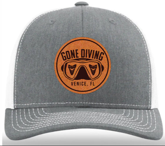 Custom Leather Engraved "Gone Diving, Venice, FL" TM Patch on a Richardson 112 - Trucker Hat.